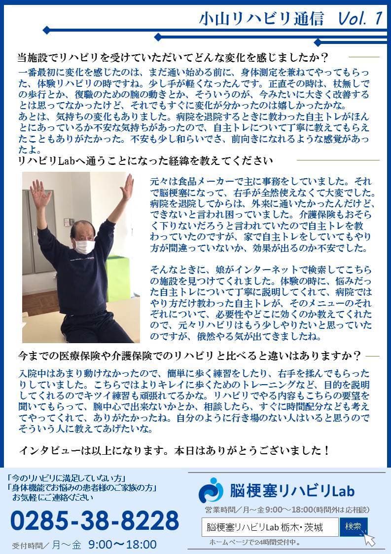 そんな中で、娘がインターネットの検索サイトから小山にリハビリ専門の施設があることを探し出してくれました。webサイトを見てみると体験キャンペーン中と書いてあったので、「先ずは相談だけでも受けてみよう」と電話を掛けました。