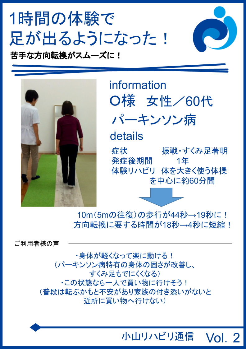体が軽くなって、歩きも足が出しやすくなりました。向きを変えるのが特に苦手でしたが前よりスムーズにできるようになりました。